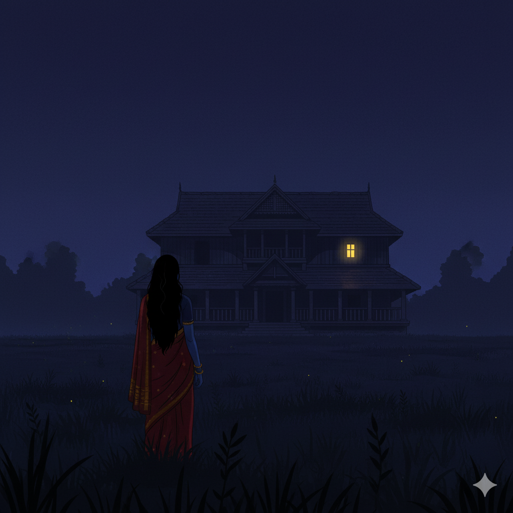 Heartbroken yet serene, Bhairavi withdrew from her celestial sisters. Wandering alone, her divine feet led her to the grand ancestral home of Pengottu Illam, where two lamps flickered with sacred light atop the mansion. Drawn by that subtle glow, Bhairavi ascended unseen and took her abode there — silent and radiant. From that moment on, prosperity began to shower upon the household. Wealth multiplied, health flourished, and good fortune filled the air. Yet, those within the Illam could not comprehend the divine presence among them. Strange signs appeared — the fragrance of sandal and lotus, sudden glimmers of gold in the dark, and dreams of a radiant goddess — but the mortal minds failed to recognize the truth.